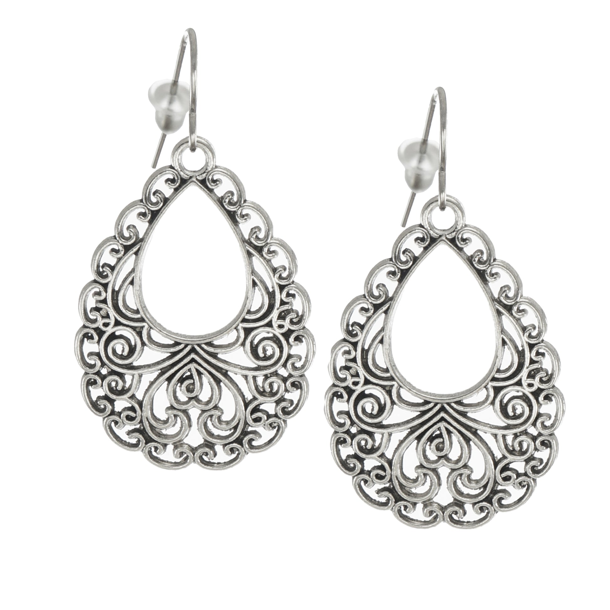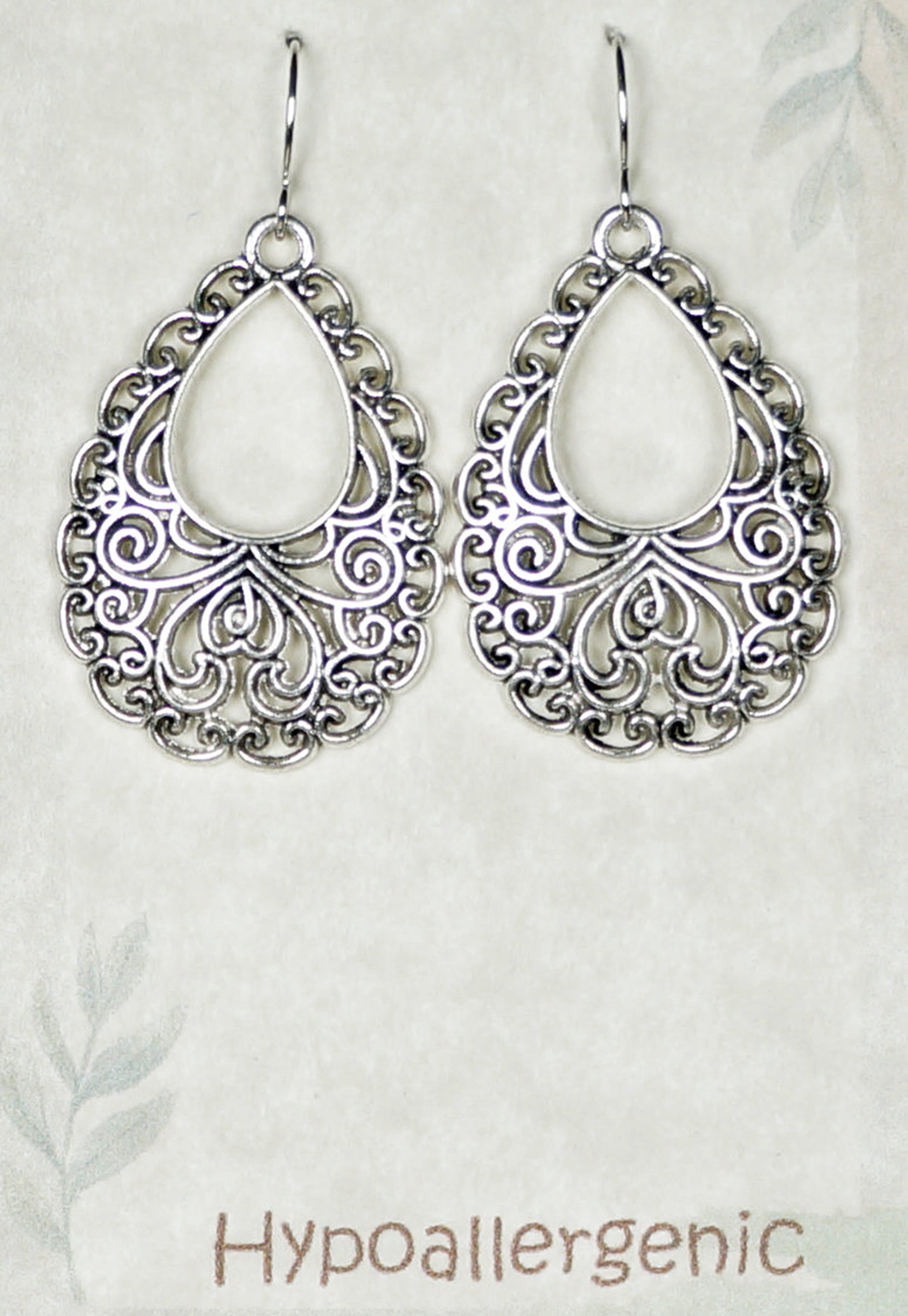 Elevate your accessory game with these exquisite filigree teardrops! Intricate antique silver detailing creates an heirloom-worthy look that's anything but ordinary. The delicate lacework catches the light beautifully, making these boho beauties impossible to ignore. Balanced on hypoallergenic platinum ear wires, they're as comfortable as they are gorgeous—perfect for sensitive skin and endless wear. Gift them to the bohemian soul in your life, or keep them all for yourself!