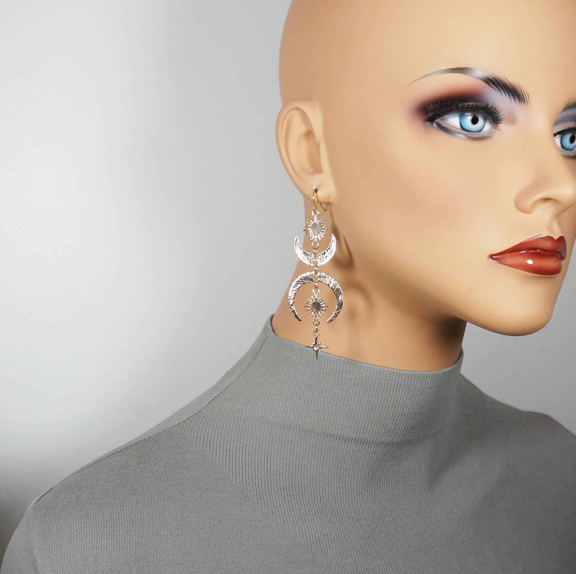 These chic celestial earrings feature shiny textured crescent moon drops with sun and star drops. All the drops move independently for an interesting look. They are sure to compliment many outfits. They are lightweight and comfortable to wear.