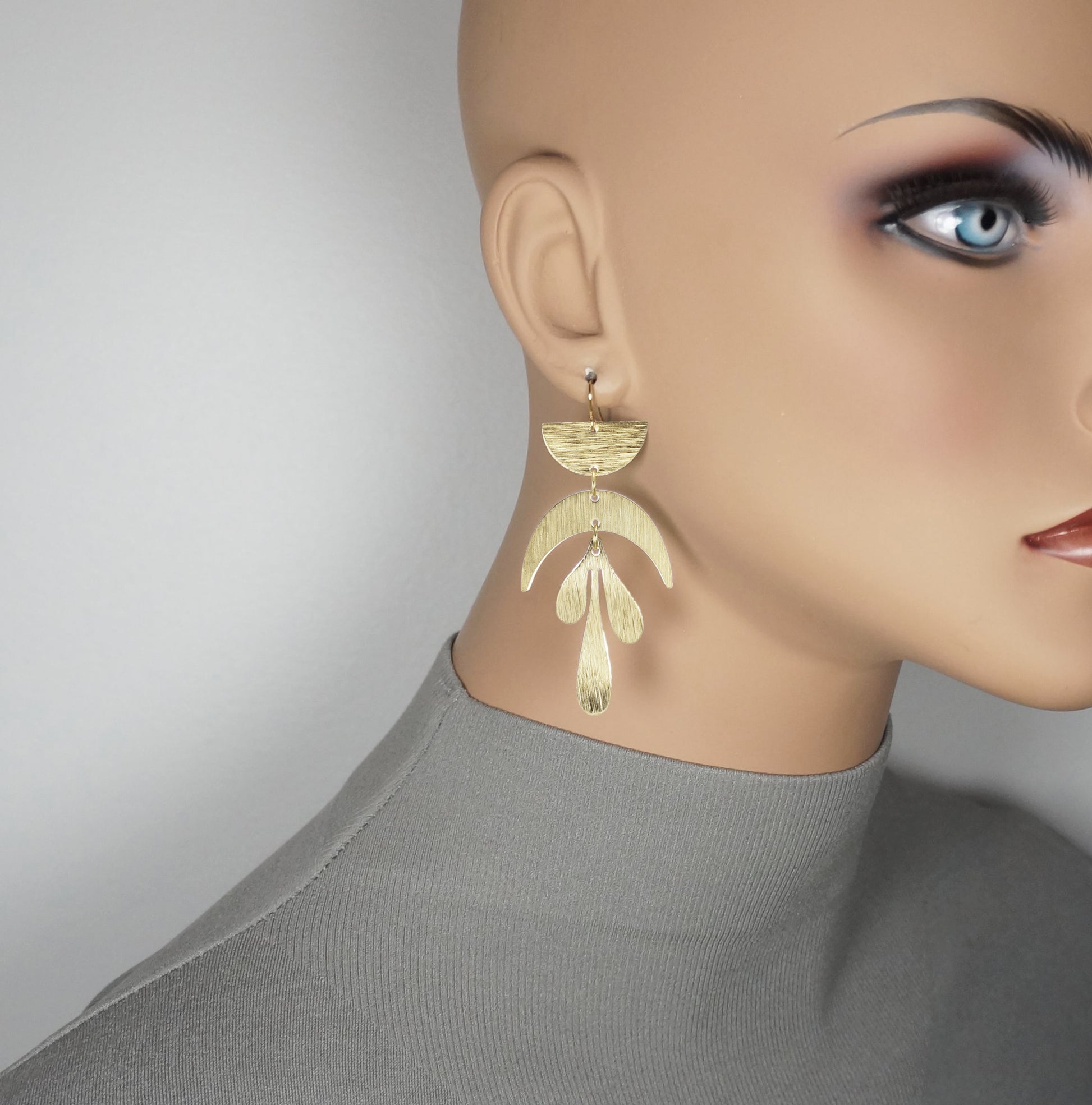 Beautiful Brushed Gold Celestial Moon Abstract Boho Statement Earrings, 18k Gold Ear Wires