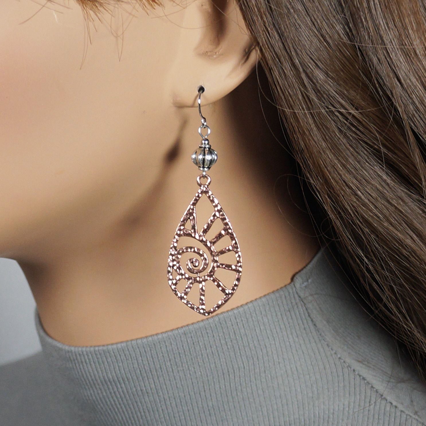 Swirl into boho bliss with these eye-catching mixed metal beauties! Featuring a radiant copper swirl teardrop paired with a shimmering silver fluted bead, these earrings blend warm and cool tones for effortless style. Hypoallergenic platinum ear wires keep them comfortable for all-day wear, making them perfect for sensitive ears. Whether you're dressing up or keeping it casual, these playful drops add just the right amount of sparkle and personality to any look. A thoughtful gift that says "I get your vibe."