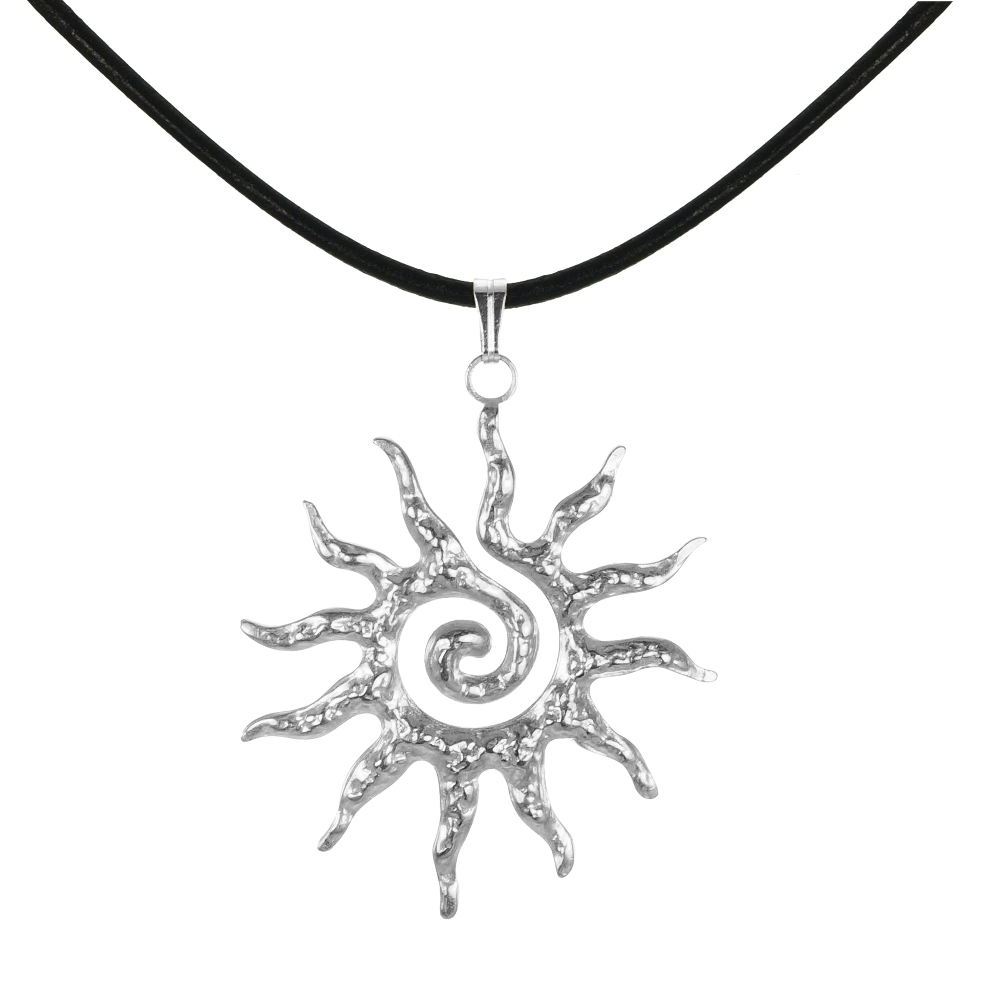 This classy handmade leather cord necklace features a hammered celestial sun shaped hammered silver stainless steel pendant which measures 1 5/8 inches across. It is certain to match many outfits.