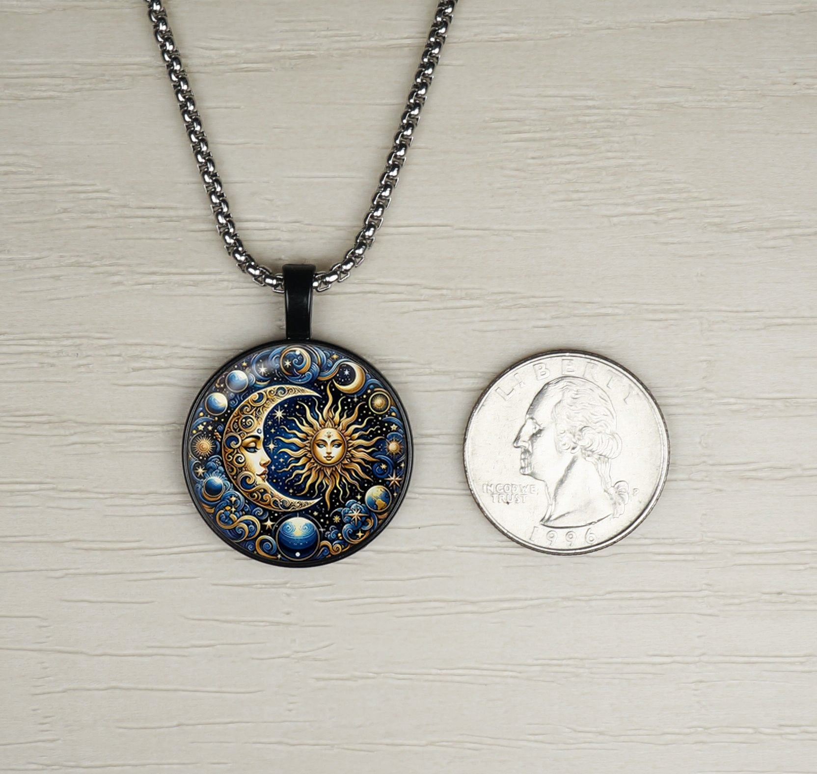 Celestial Blue Highly Detailed Sun Moon Boho Pendant, Stainless Steel Chain Necklace, Length Choices