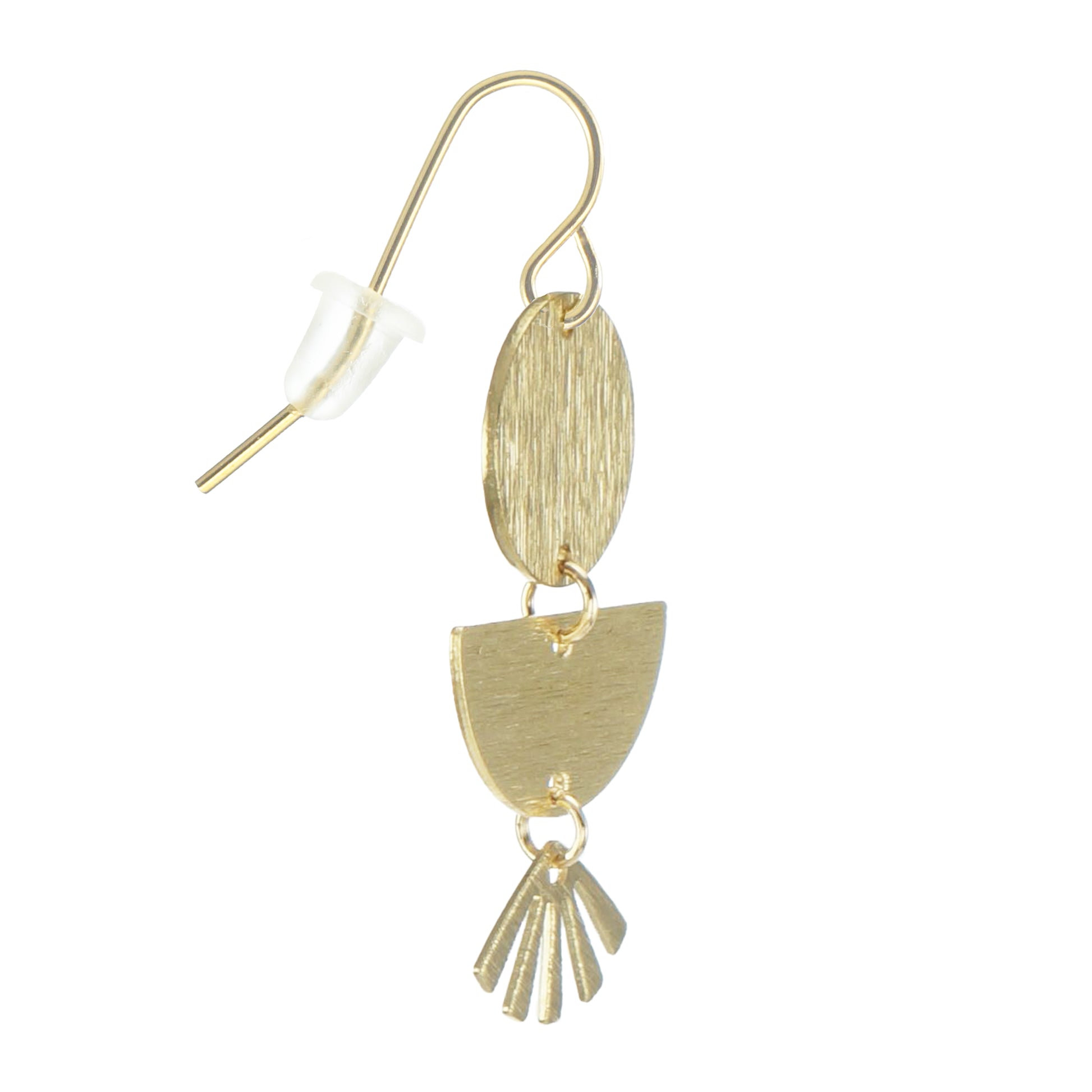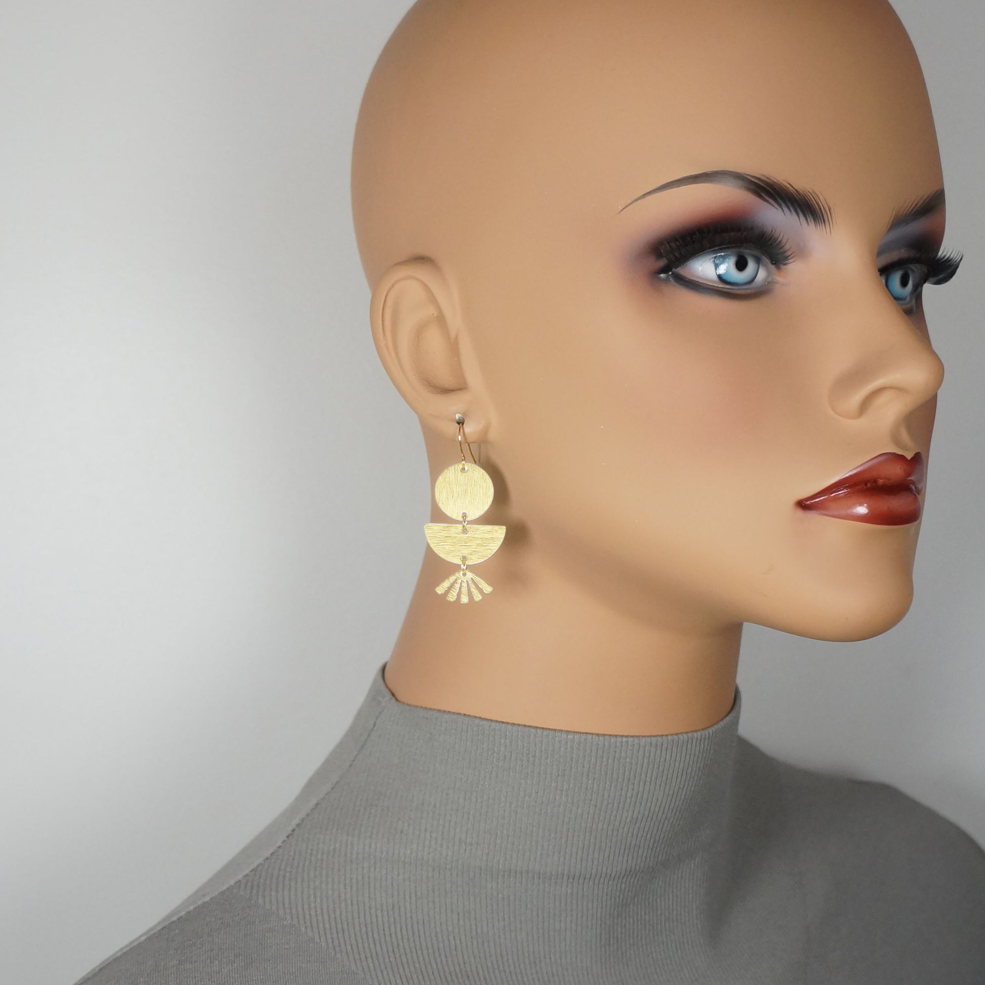 These fashionable earrings will quickly become your go to everyday earrings. They are made with brushed gold drops in three different shapes. They have great movement and catch the light as they dangle around. They are super lightweight and comfortable to wear, and will certainly coordinate with any outfit.