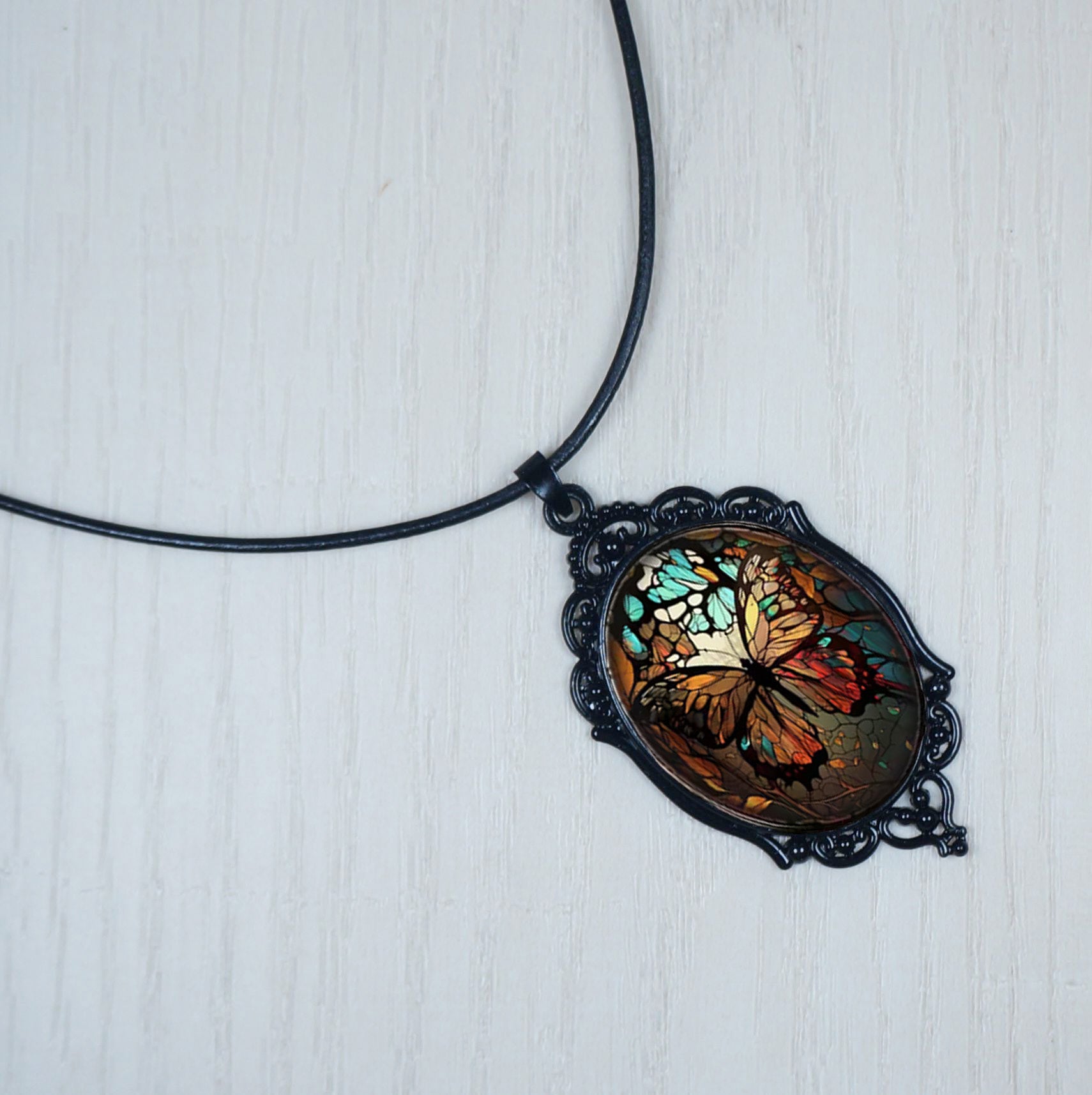 Intricate Highly Detailed Oval 2-D Butterfly Pendant Leather Cord Boho Necklace, Black or Tan Leather, Length Choicesngth Choices, Gift for Her (Copy)