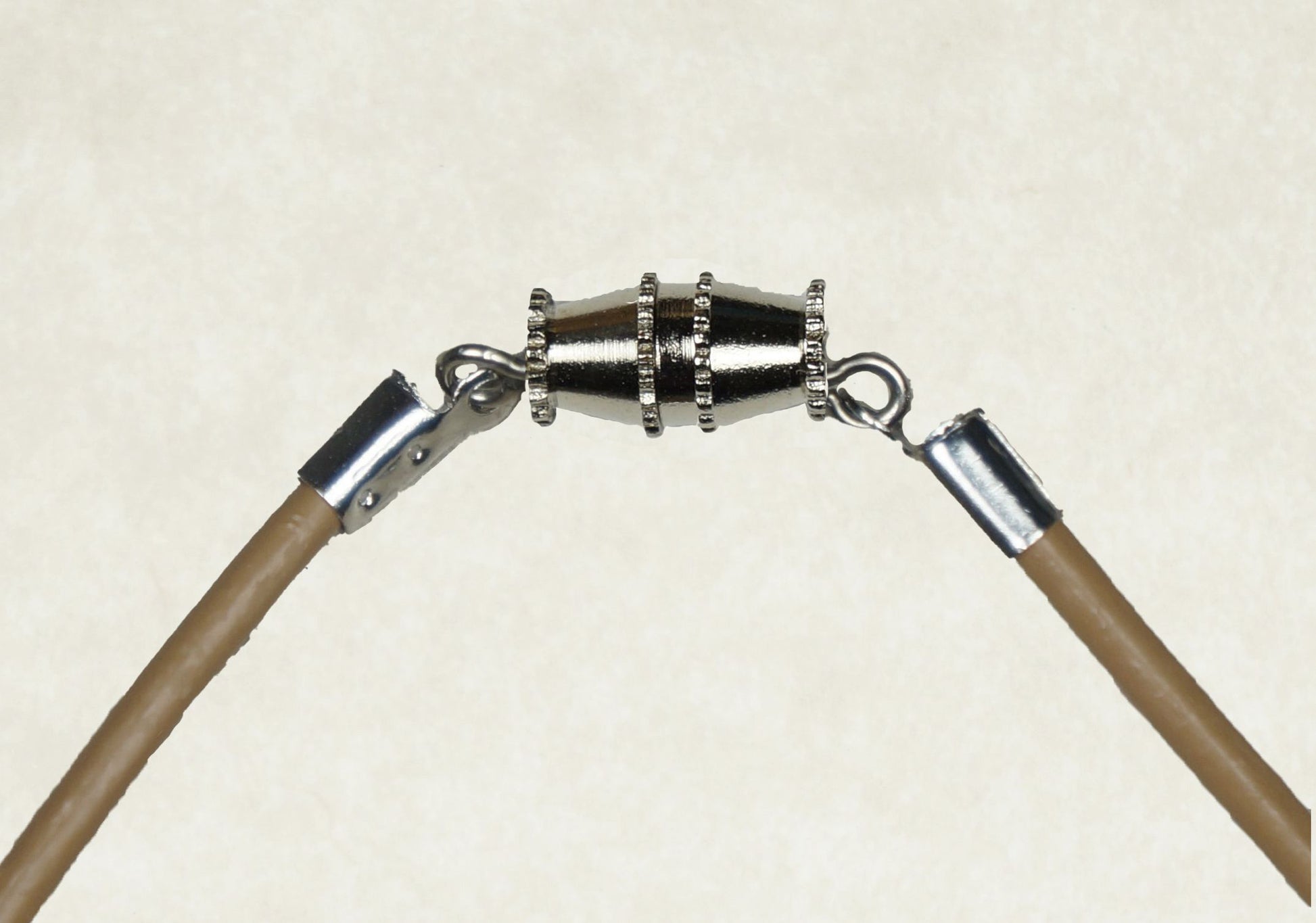 The smooth leather cord is 2mm thick and available in your choice of 18 or 20 inches long. You have your choice of black or tan leather. The tan leather color may vary slightly by dye lot. It finishes with a barrel clasp.