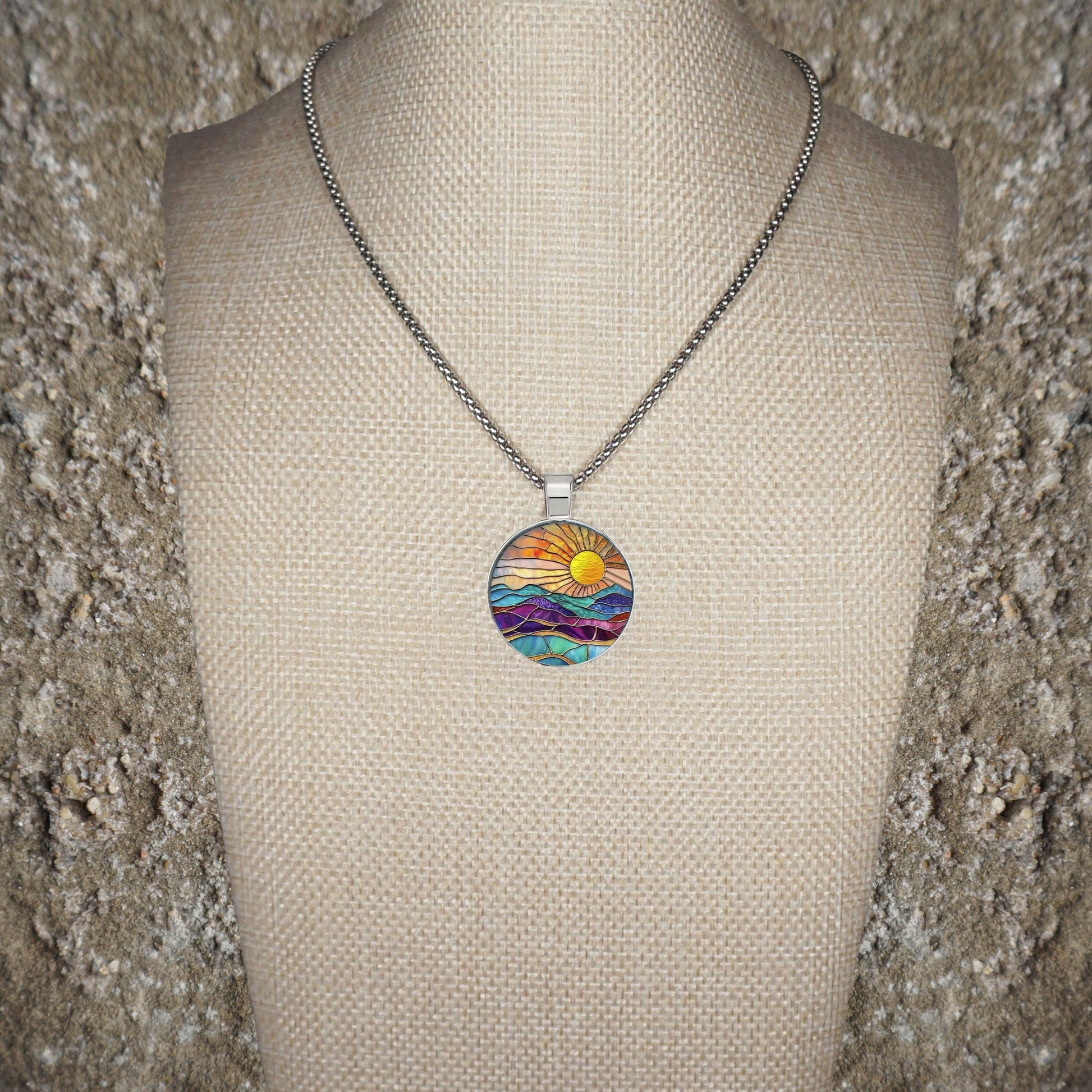 Intricate Highly Detailed Rainbow 2-D Stained Glass Look Sun Pendant, Stainless Steel Necklace, Length Choices