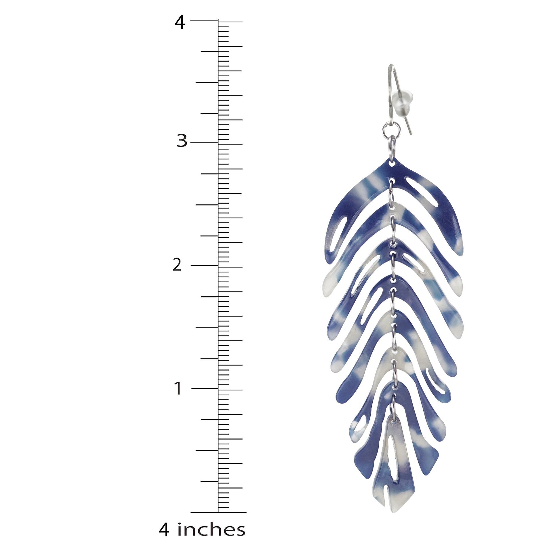 These eye catching earrings feature long leaf shaped acrylic drops. Each section moves independently giving them an interesting look as they dangle around. You have your choice of red, green, or blue. They are sure to compliment many outfits. These are very light weight and comfortable to wear. Please expect variations as the placement of the splashes of color are random.