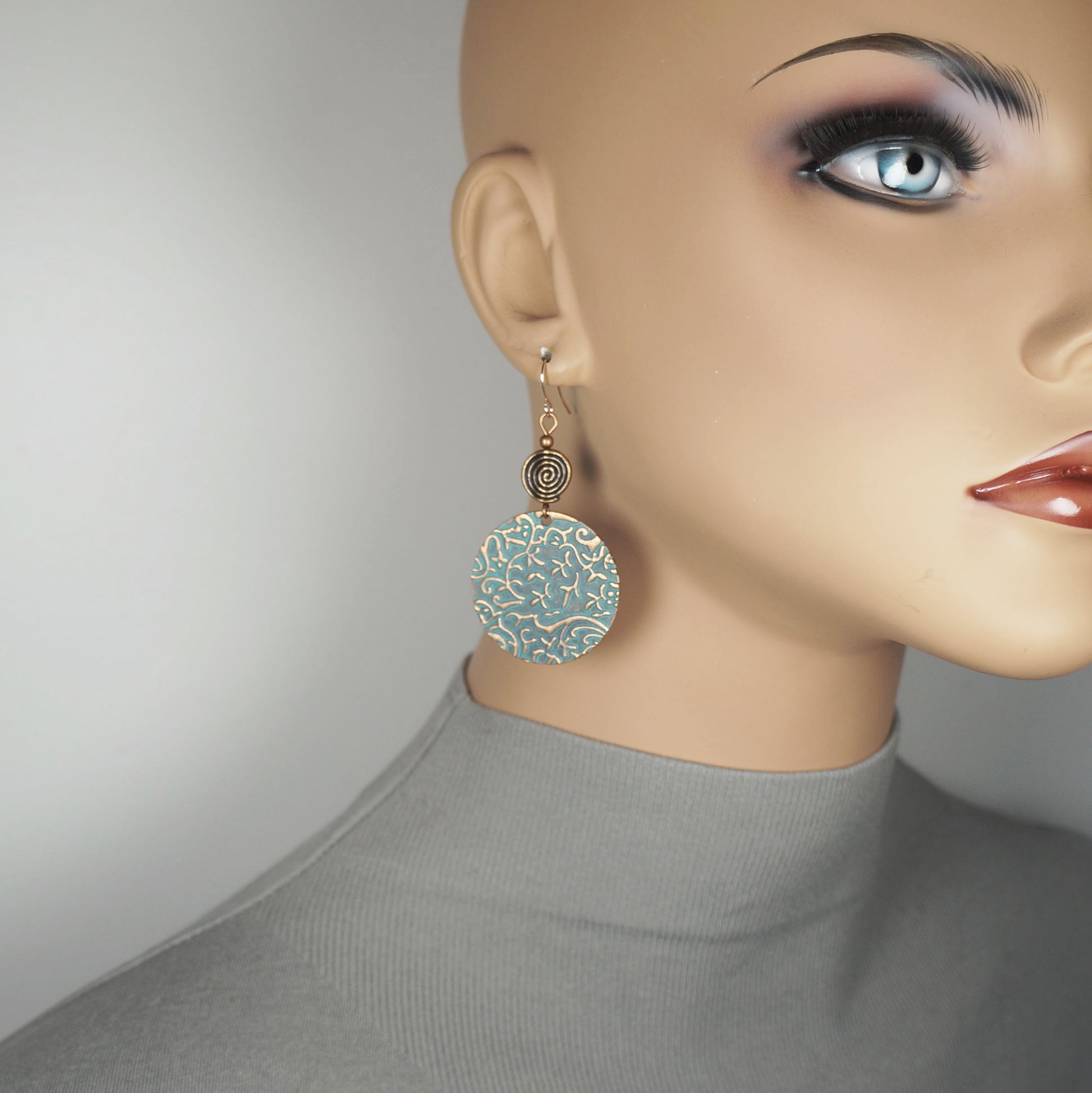 Round Copper Patina Rustic Boho Swirl Statement Dangle Earring, Rose Gold Ear wires