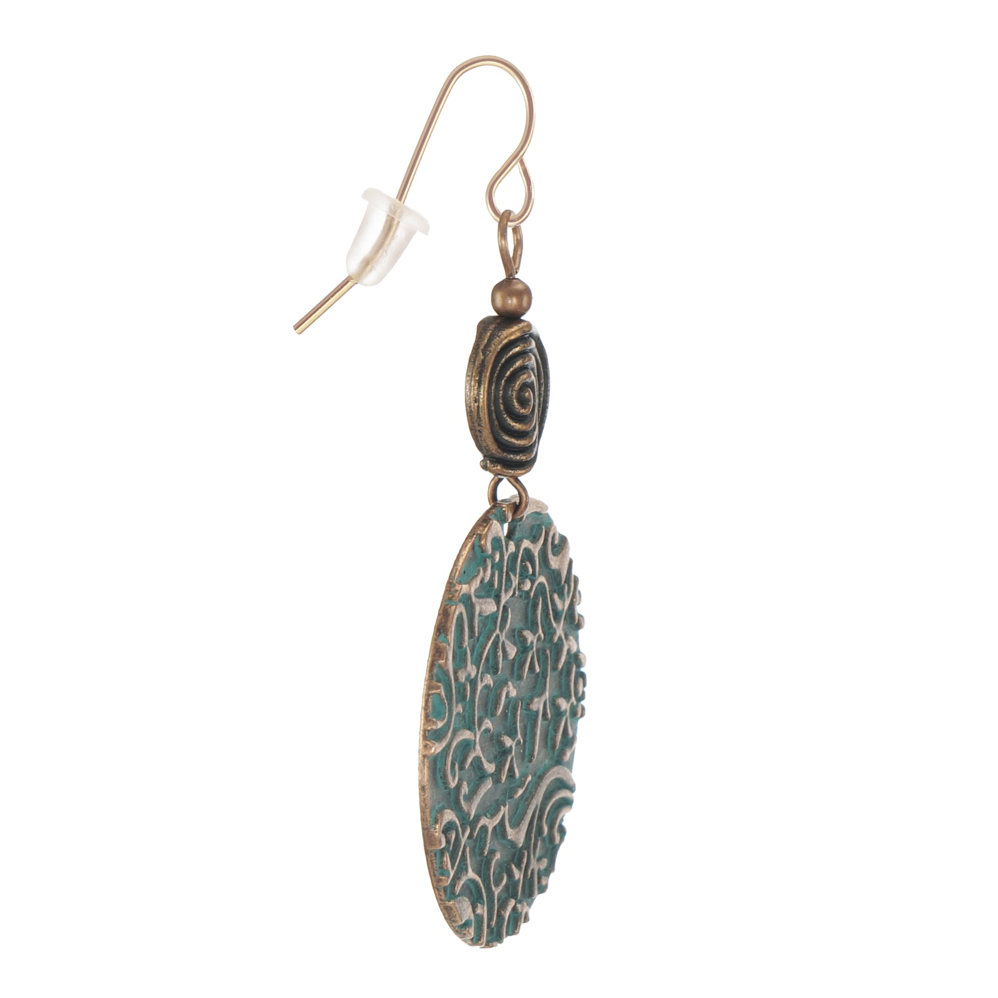 These unique vintage inspired earrings will catch everyone’s eye. They are handmade using a round vine pattern copper patina disc hanging from a copper swirl bead. They are sure to compliment any outfit.