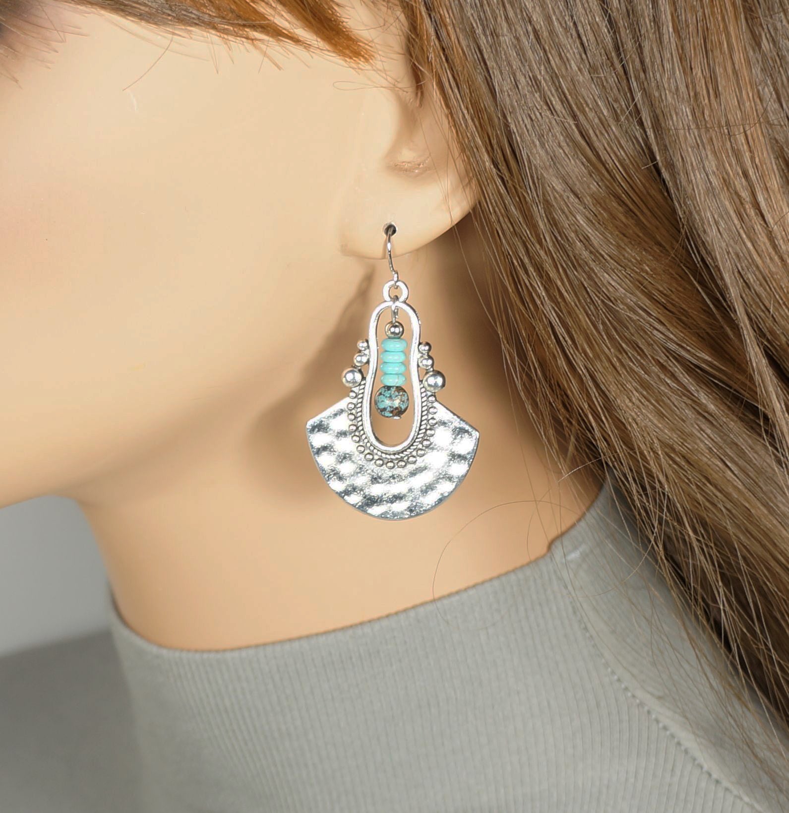 These unique handmade earrings feature pretty abstract shaped hammered silver alloy drops. In the center of each drop are pretty turquoise beads for a pop of color. These will coordinate with many outfits.