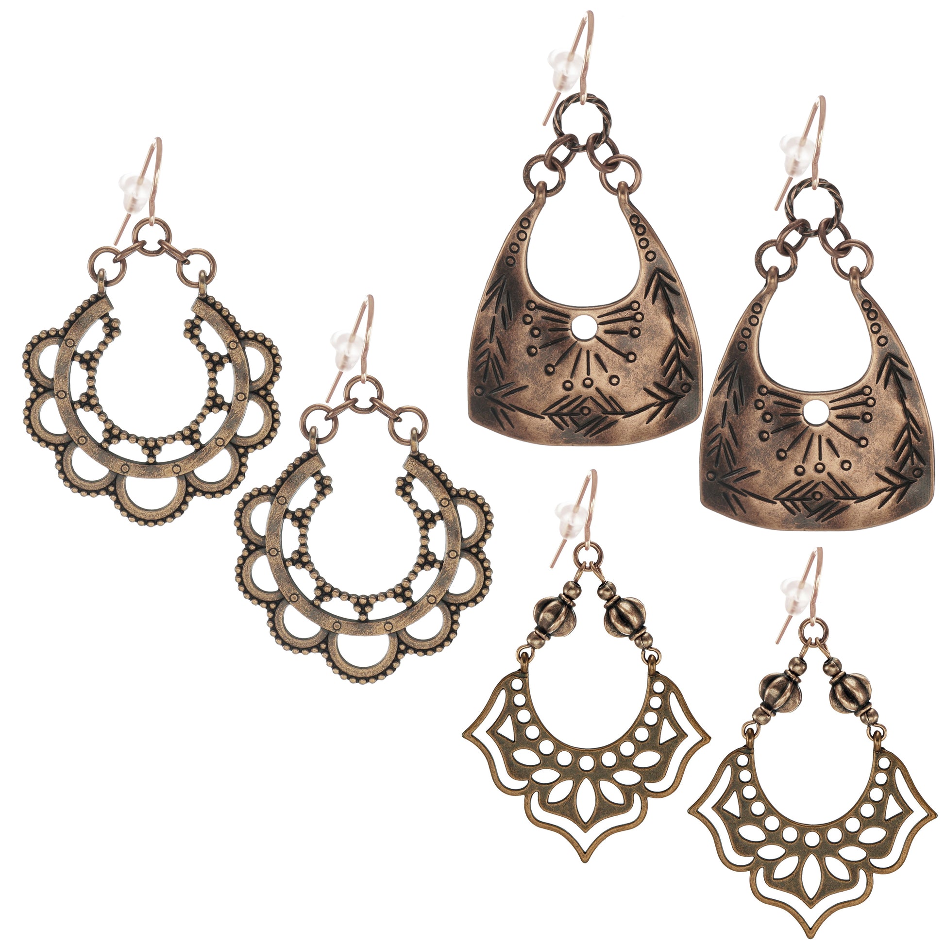 This earring set well quickly become your favorites. You get 3 unique styles of antique copper drops with various rings and beads. These will compliment many outfits. This set is a great value for your money.