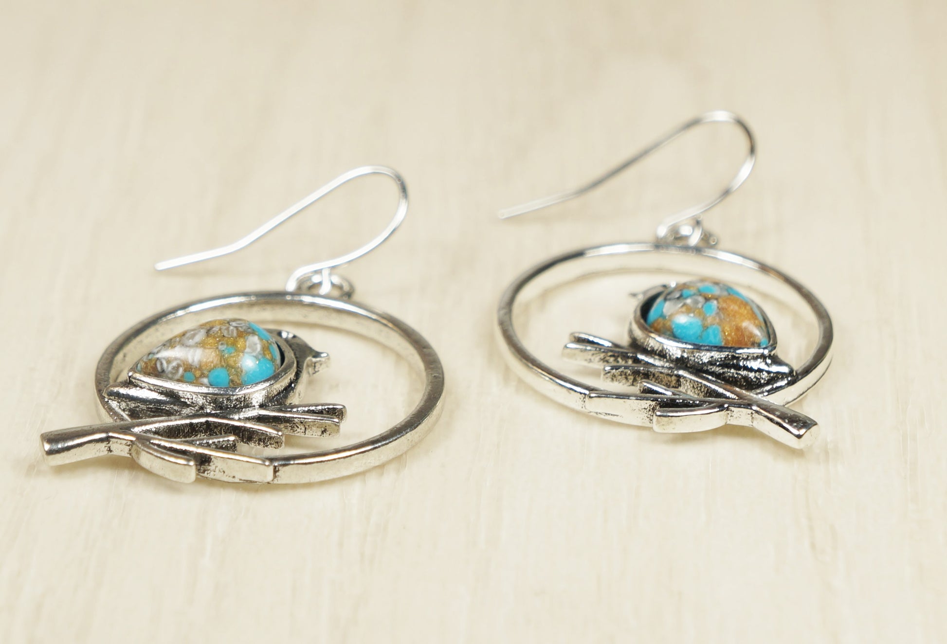 Turquoise Inlay Silver Bird Minimalist Dangle Earrings, Nickel Free, Platinum Ear Wires