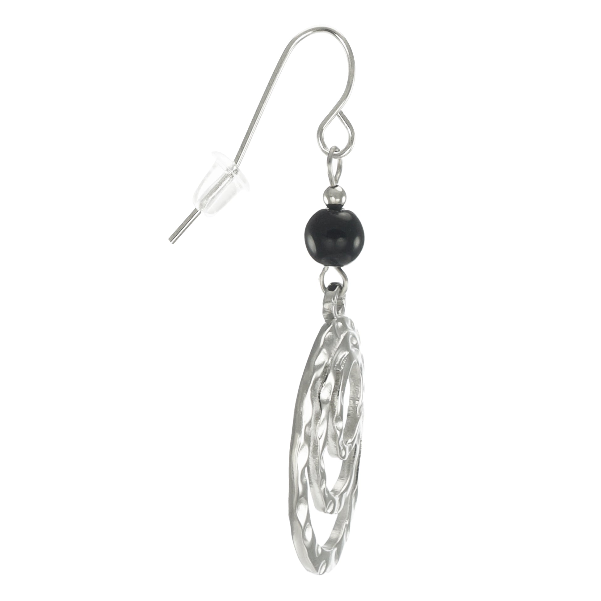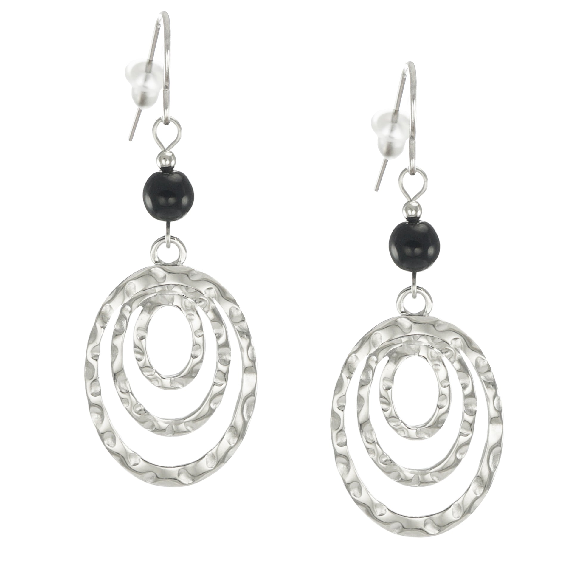 Silver Oval Hammered Drops with Black Beads, Lightweight Boho Statement Earrings, Hypoallergenic Ear Wires, Gift for Her