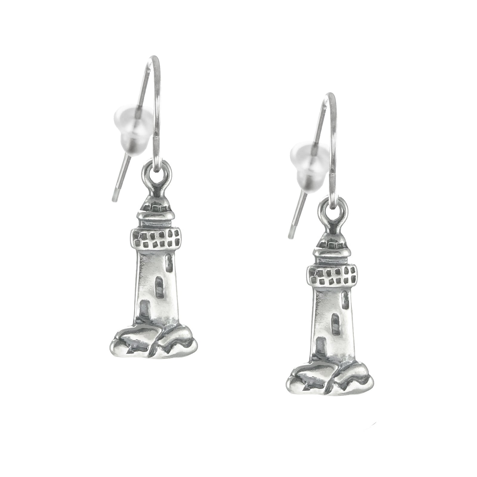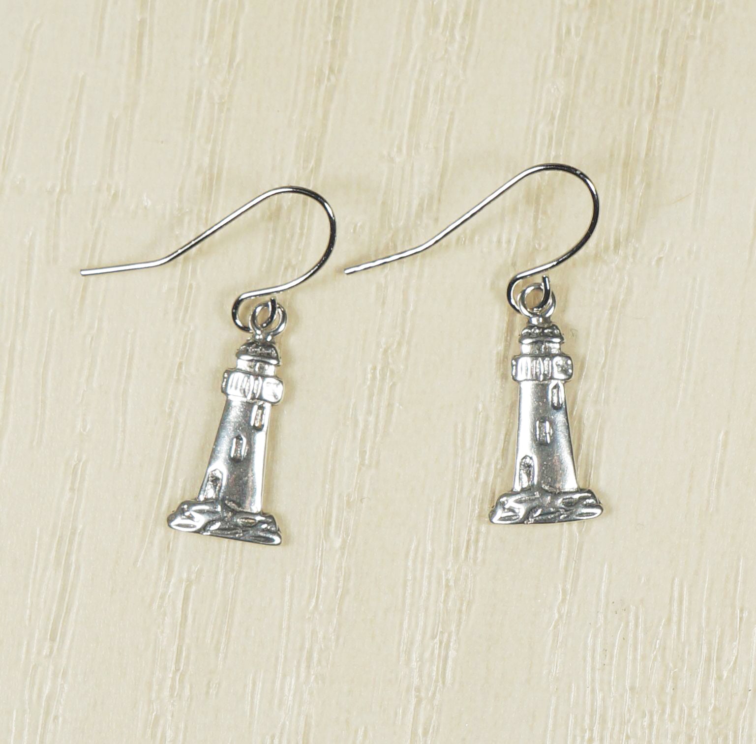 Small Sterling Silver Lighthouse Earrings, Hypoallergenic Platinum Ear Wires, Gift for Her