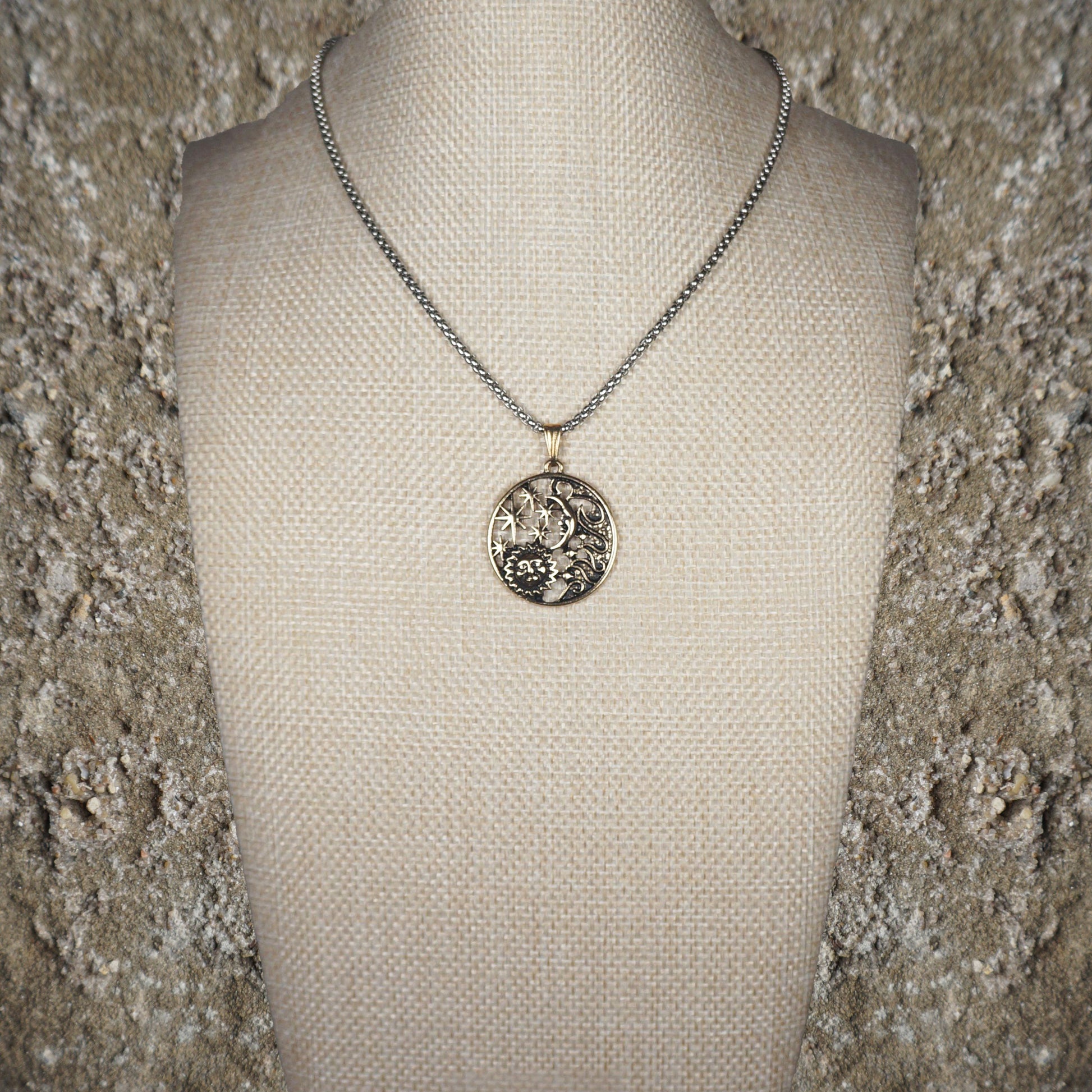 Reach for the cosmos with this enchanting celestial pendant featuring a radiant sun, crescent moon, and twinkling stars in warm antique gold. Suspended from a durable stainless steel chain, this unisex design celebrates the magic of the night sky and the beauty of celestial wonder. Choose your perfect length to make it uniquely yours—whether you prefer it nestled close or making a statement. A timeless piece that brings a touch of cosmic charm to any outfit, day or night.